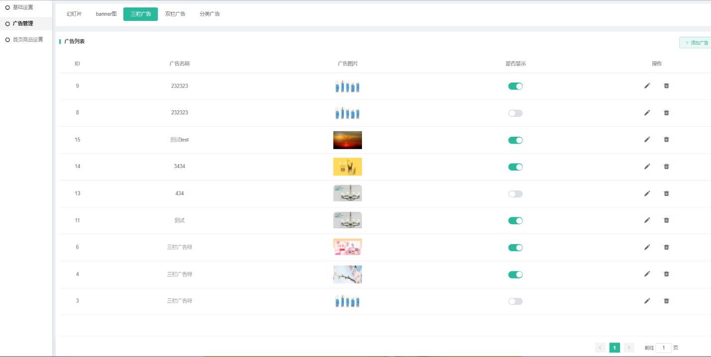 1、幻灯片:幻灯片创建ID,幻灯片名称、图片、是否显示、编辑或删除。