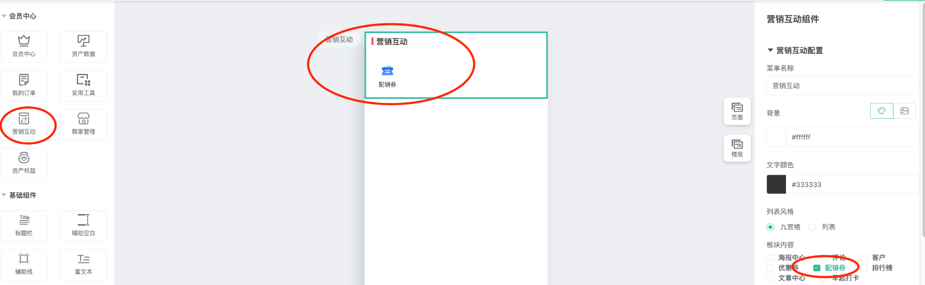 (一)会员中心--营销互动--显示“配销券”入口。系统页面会自带,也可后台通过装修会员中心勾选显示。