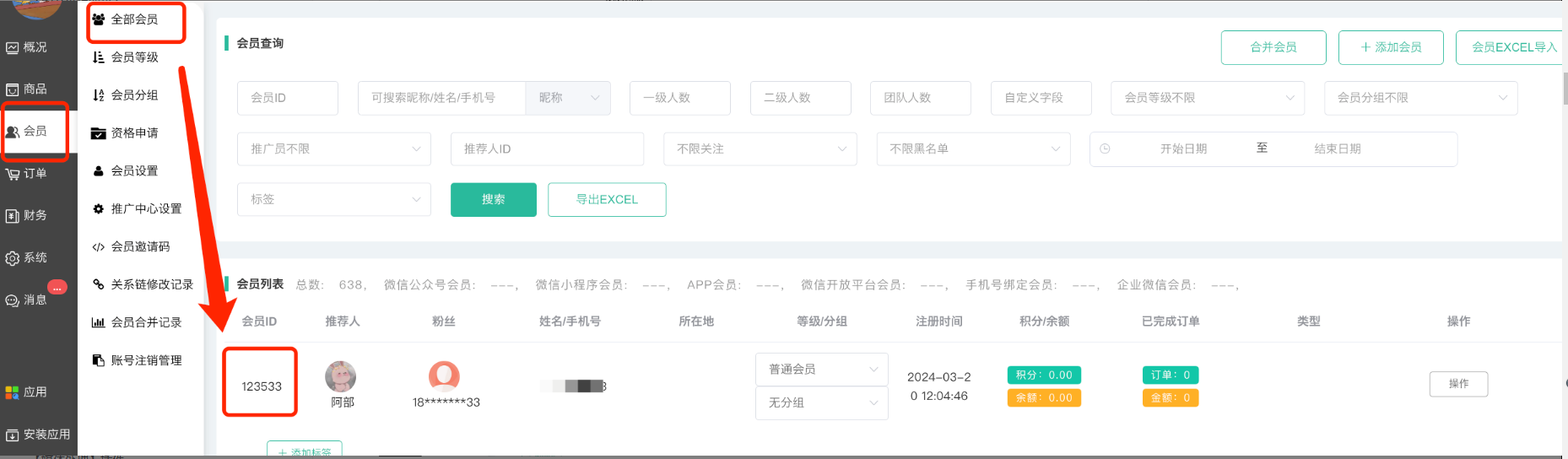 发放会员ID是填写会员的ID,可在后台会员列表那查看(如下图查看路径)。如果要发放给多个会员,请用“半角逗号”隔开,比如1,2,3, 注意不能有空格。