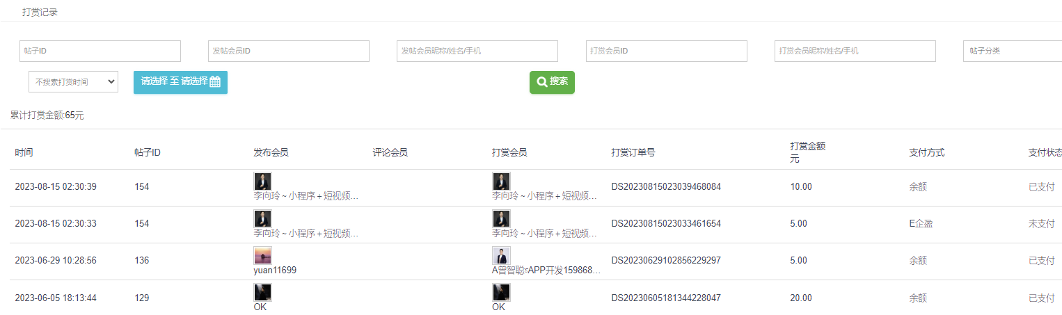 打赏详情包含对应的帖子ID,发布帖子的会员、打赏帖子的会员,对应打赏订单号,打赏金额(保留两位小数),打赏支付方式以及支付状态。