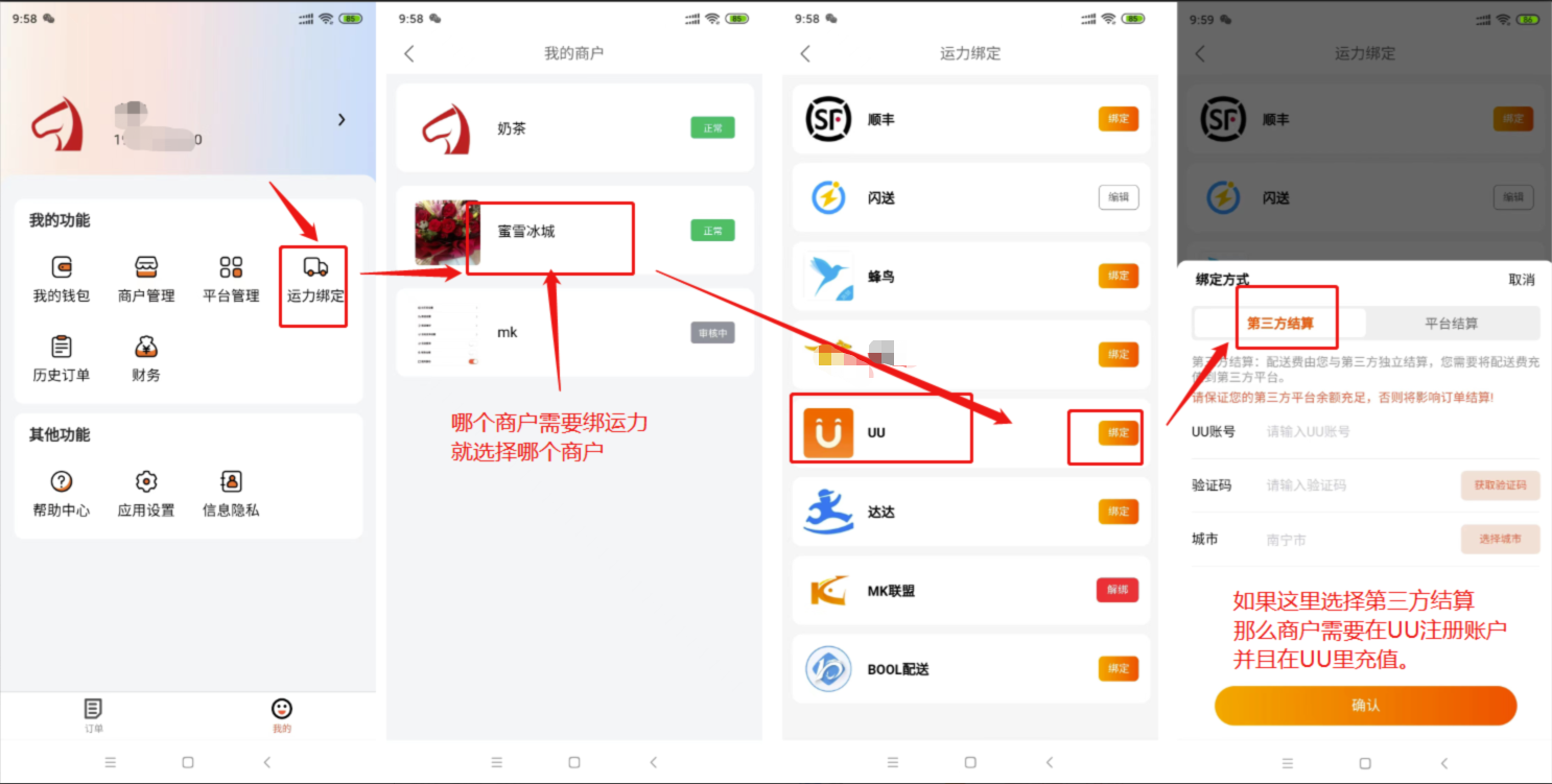说明:绑定第三方运力时,如果选择“第三方结算”那么商户的配送费是和第三方结算,商户需要在第三方运力平台注册账户并且充值。