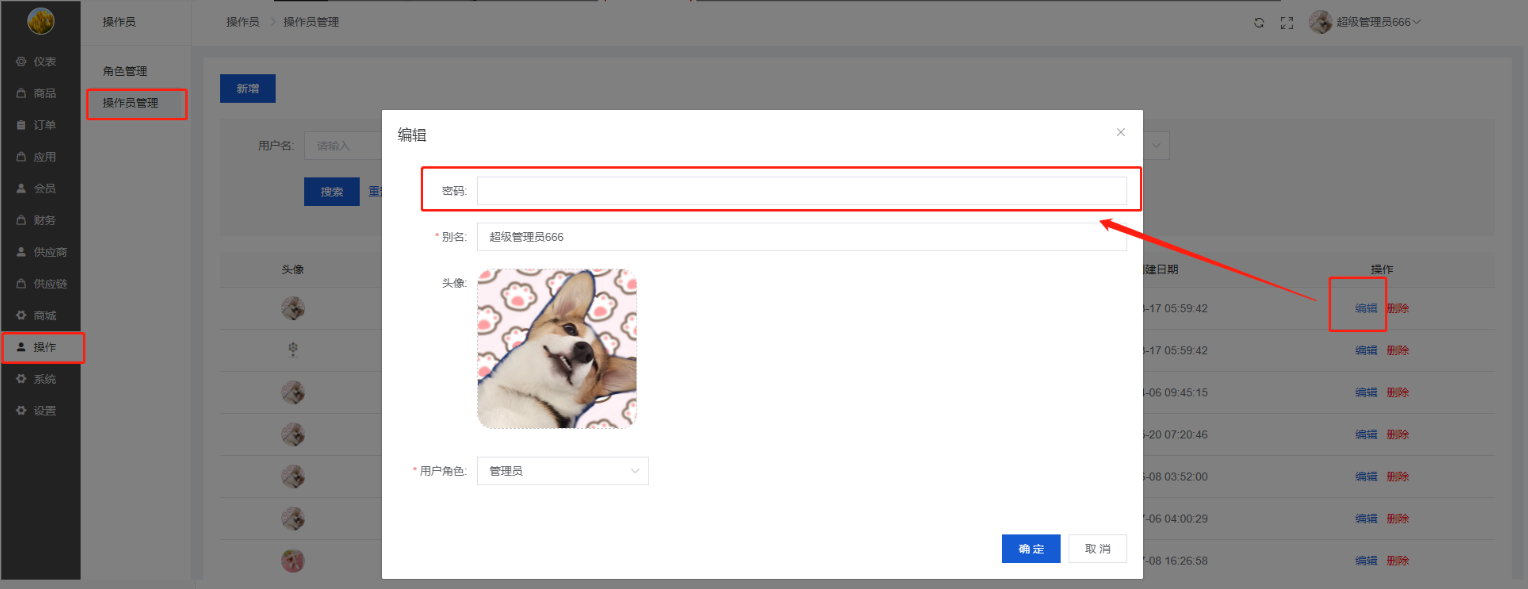 2)若总管理员和操作员需要修改登录密码的,可以点击 编辑 进入修改;