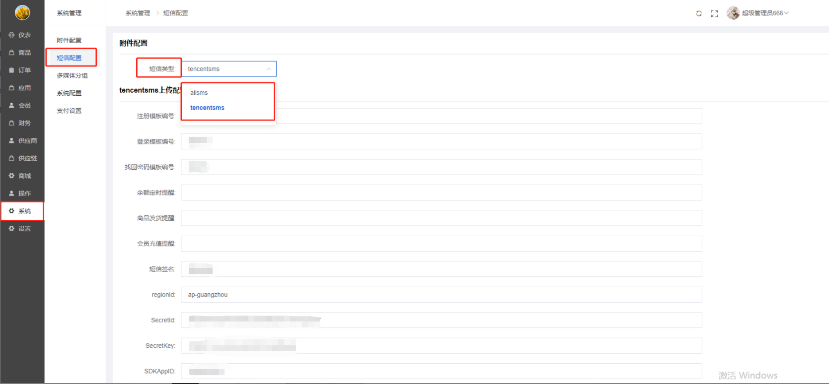 商城短信服务,选择对应短信类型(腾讯云/阿里云),进行短信配置;