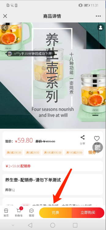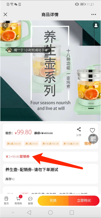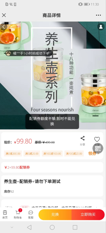 2、用户购买商品获得配销券后,可去专区产品里使用配销券+xx元进行兑换(金额参数后台自定义设置) .