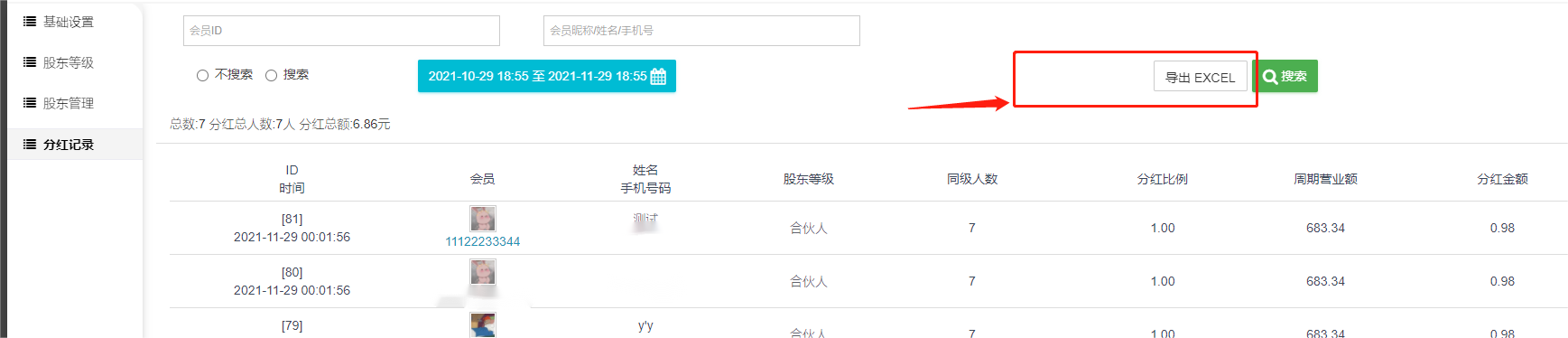 ③可通过会员ID、会员昵称/姓名/手机号、时间筛选对应分红详情