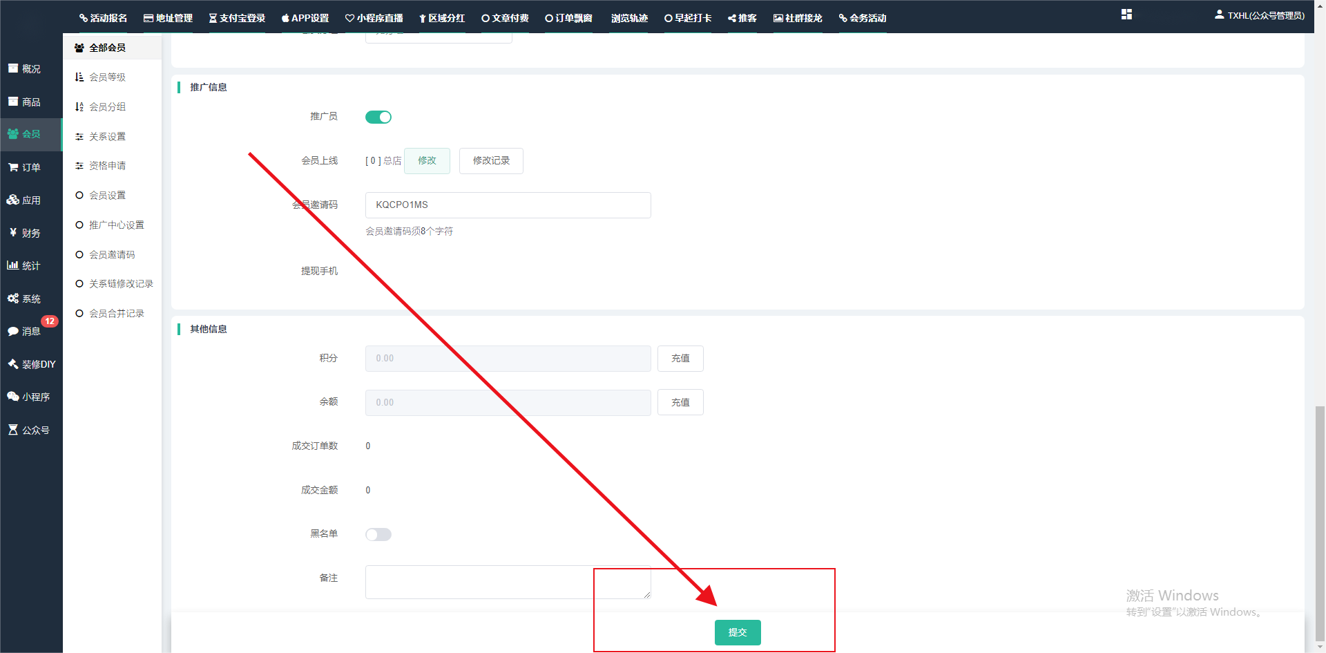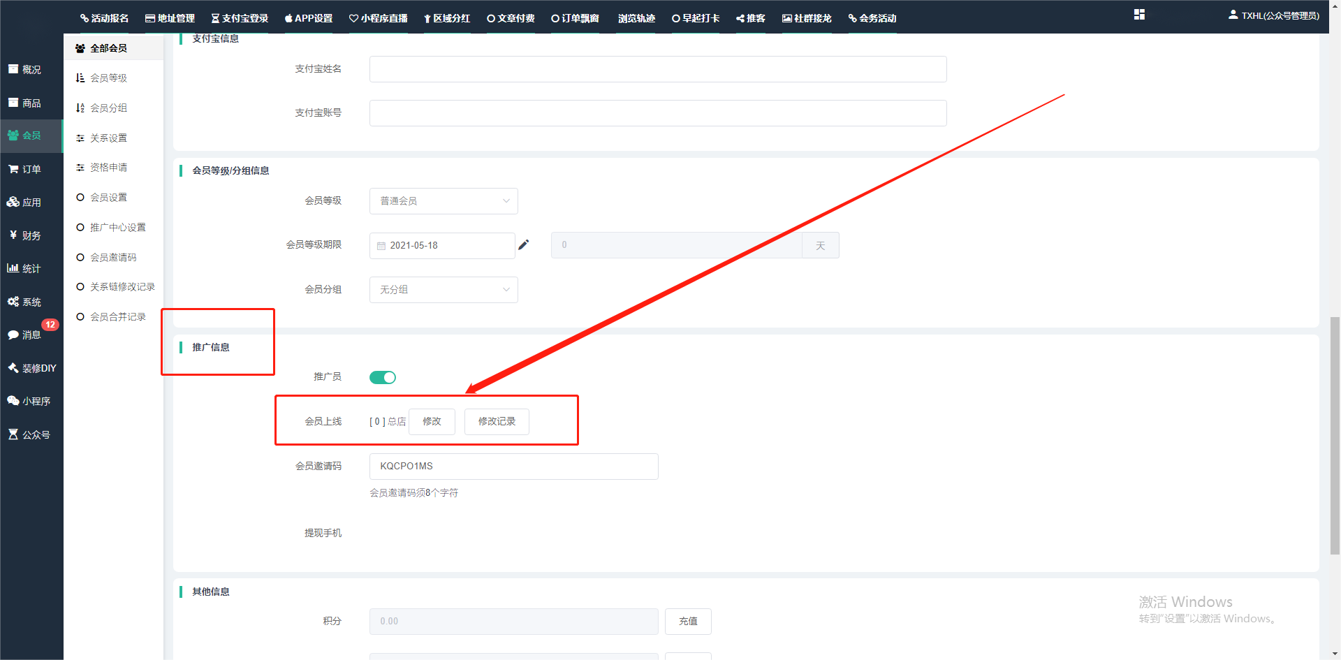 目录 搜索 展开 一、前期准备资料二、数字乡村码-上线操作指南1、服务号的申请流程及认证2、申请小程序流程3、开放平台绑定小程序和公众号三、数字乡村码-系统操作数字乡村码系统管理-概况数字乡村码-商品管理1、发布商品2、商品列表3、商品表单4、商品分类5、品牌管理6、配送模板7、评论管理8、优惠券管理9、商品标签10、退货地址设置11、满额优惠12、批量操作13、配送方式14、基础设置15、商品隐藏四、数字乡村码-会员管理1、全部会员2、会员等级3、会员分组4、资格申请5、会员设置6、推广中心设置7、会员邀请码8、会员关系链修改关系链修改记录9、会员合并记录10、账号注销管理11、会员设置中心五、数字乡村码-订单管理1、订单管理列表2、订单处理流程3、订单状态4、订单修改价格5、订单退款退货6、多包裹发货7、批量发货订单操作步骤8、催发货订单9、物流查询六、数字乡村码-财务管理1、余额设置2、会员余额3、充值记录4、转让记录5、余额明细6、收入明细7、提现设置8、提现统计9、积分管理10、转账审核11、收益广告12、批量充值七、数字乡村码-系统管理1、商城入口2、商城设置①、商城设置②、订单设置③、物流查询④、短信⑤、联系方式⑥、分类⑦、优惠券⑧、分享⑨、幻灯片⑩、广告位⑫、地图设置3、交易设置4、微信模板消息自定义消息模板(新版)自定义消息模板(旧版)小程序消息模板公众号模板消息变更公告5、语言设置6、权限管理7、多媒体管理八、数字乡村码-消息管理九、数字乡村码-应用管理十、数字乡村码系统-数据统计十一、数字乡村码-页面装修DIY1、模板管理2、店铺页面3、顶部导航4、底部导航5、DIY模板市场6、首屏广告7、基础设置8、装修DIY尺寸建议十二、供应商功能插件操作指南1、供应商2、门店-收银台门店申请和使用步骤门店管理①、门店-收银台 营销设置②、门店-收银台 分润设置门店分类门店申请门店审核门店商品门店商品订单收银台订单数据统计核销员基础设置默认设置门店装修3、微社区4、会务活动十三、营销插件操作指南活动报名提货卡新人奖微店问卷调查积分视频分享1、视频分享基础设置2、视频分享发现管理3、视频分享分类管理4、视频分享评论管理5、视频分享分红记录6、视频分享短视频中心每日红包幸运大抽奖签到优惠券二维码任务奖励优惠劵文章音频文章付费文章限时购新海报拓客卡操作流程积分活动素材中心视频红包十四、入驻门店应用类1、门店预约2、附近商品3、门店定位设置4、门店控制5、门店满额包邮6、门店满额减7、导入商品8、门店搜索9、门店股东10、核销券11、多门店核销1、商城后台设置2、前端功能演示十五、常见问题1、后台登录密码修改流程2、会员-余额,积分,后台如何进行充值与扣除3、如何修改上下级关系4、一种万能的获取商城小程序路径的方法 暂无相关搜索结果! 阅读次数:1453 本文档使用 模王系统 发布 3、如何修改上下级关系 如何修改上下级关系一.如何修改上下级关系?1.会员-全部会员-可以通过搜索用户的独立ID,或者用户微信昵称,找到此会员,然后点击右边的(操作)2.再点击会员详情。3.滑到下面,有个推广信息-会员上线,点击修改4.输入上级的ID号,点击搜索,出来此上级会员后点击选择。5.滑到最下面,一定要点击提交按钮。文档更新时间: 2024-01-05 14:50 作者:链上旅行