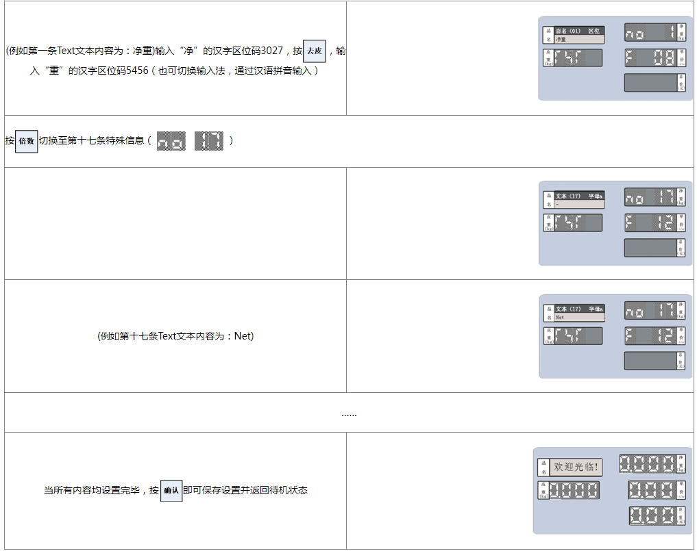 阅读本手册时,操作见表格最左列,表格其余列为实施最左列操作后条码打印计价秤各个窗口的显示内容;