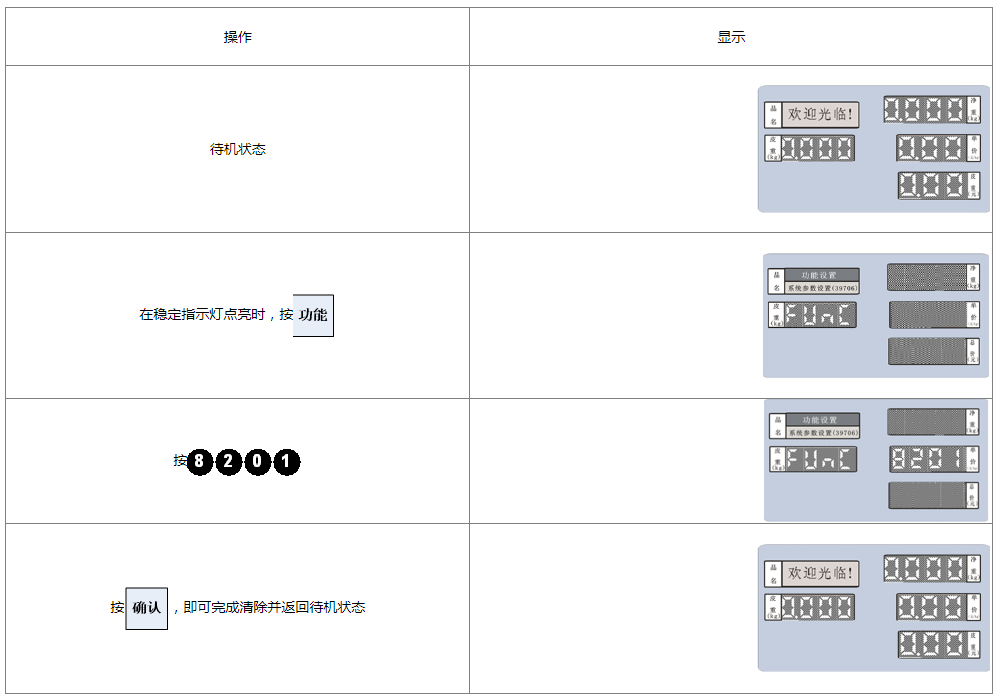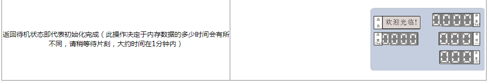 注:此功能将全清电子秤的PLU信息,标签信息,报表信息,及所有相关的设置,且不可恢复,请慎重决定是否使用此功能。
