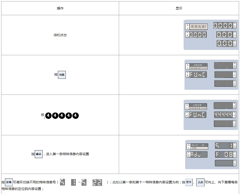本秤可设置10条汉字特殊信息(编号从1到10)及12条字符特殊信息(编号从11到22),标签纸状态下可供每条PLU信息调用其中的任意3条打印;连续纸状态下,其中的1~4号汉字特殊信息对应表头的1~4行,5~8号对应表尾的1~4行。每条汉字信息内容最多可设置30个汉字,每条字符信息内容最多可设置30个字符。特殊信息设置密码为“44444”。